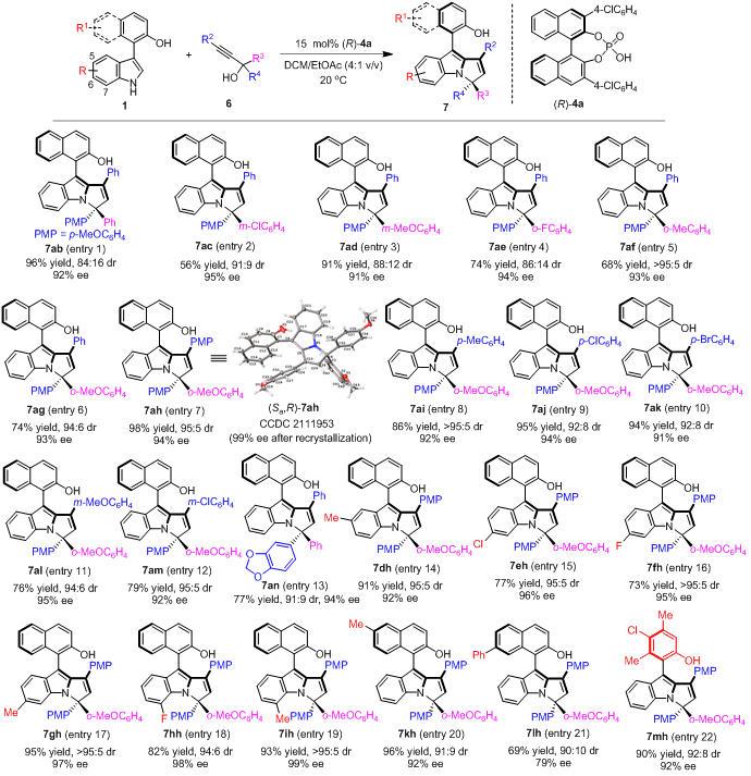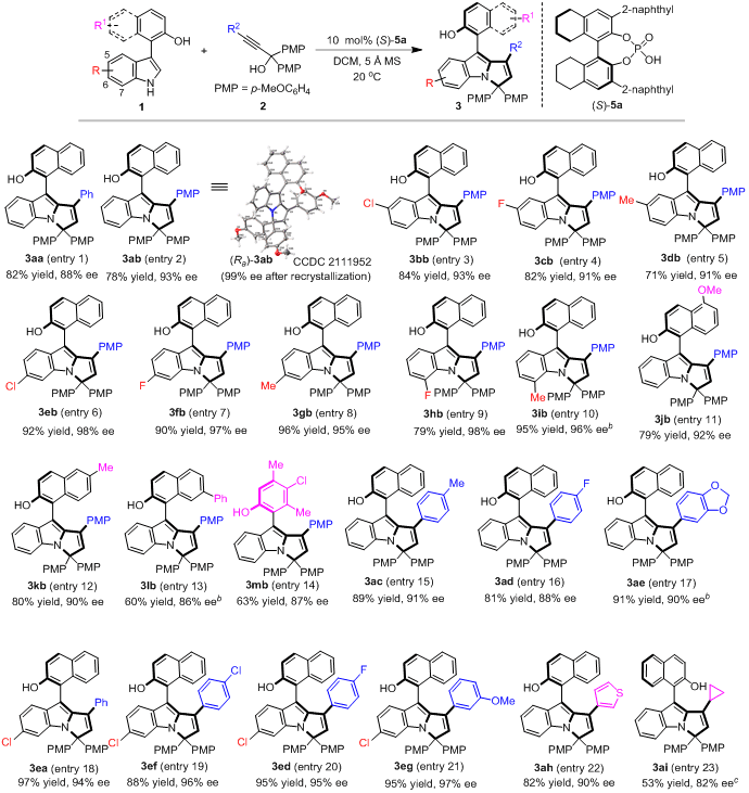 所以,在該工作的設(shè)計中(圖3c),作者設(shè)想此類炔丙醇可以作為合適的1,3-雙親電試劑,在CPA催化下與3-芳基吲哚發(fā)生對映選擇性的(2 + 3)環(huán)化反應(yīng),從而構(gòu)建新型的軸手性芳基吡咯并吲哚骨架。該反應(yīng)將通過動態(tài)動力學拆分(DKR),先發(fā)生1,8-加成反應(yīng),產(chǎn)生手性聯(lián)烯中間體,再經(jīng)歷質(zhì)子化和分子內(nèi)環(huán)化過程,生成軸手性芳基吡咯并吲哚。在反應(yīng)過程中,CPA可以依次活化3-芳基吲哚的OH和NH基團,從而控制(2 + 3)環(huán)化反應(yīng)的區(qū)域選擇性。此外,CPA與底物和中間體之間的相互作用,將促進DKR過程和立體選擇性的分子內(nèi)環(huán)化,從而控制所構(gòu)建的芳基吡咯并吲哚骨架的軸手性和中心手性。因此,所設(shè)計的(2 + 3)環(huán)化反應(yīng)將為構(gòu)建基于吲哚的新型軸手性骨架提供新策略,并且可以同時控制多重手性元素。