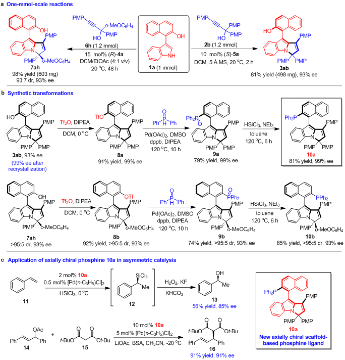 為了探究該類新型軸手性芳基吡咯并吲哚骨架的潛在應(yīng)用價值,作者對產(chǎn)物進行了合成轉(zhuǎn)化以及嘗試其在不對稱催化中的應(yīng)用(圖6)。首先,1 mmol規(guī)模的實驗結(jié)果,說明了該催化不對稱(2 + 3)環(huán)化反應(yīng)可用于放大量合成(圖6a)。其次,軸手性芳基吡咯并吲哚化合物通過衍生化,可以轉(zhuǎn)化為新型的單膦配體(圖6b)。更重要的是,該類軸手性單膦配體成功地應(yīng)用于苯乙烯的催化不對稱硅氫化反應(yīng)和Pd(II)催化的不對稱烯丙基烷基化反應(yīng)(圖6c)。這些結(jié)果表明,該類新型的軸手性芳基吡咯并吲哚骨架可用于開發(fā)新型的手性配體和催化劑,有望在不對稱催化中發(fā)現(xiàn)更多的應(yīng)用。