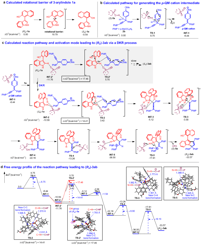 為了深化對該類新型軸手性骨架和催化不對稱(2 + 3)環(huán)化反應(yīng)的理解,作者探究了該類骨架的穩(wěn)定性,并進行了控制實驗(圖7)。實驗顯示,該類軸手性骨架具有高的穩(wěn)定性和旋轉(zhuǎn)能壘(圖7a)。此外,作者還研究了3-芳基吲哚1中OH基團以及炔丙醇2和6中OMe基團的作用(圖7b)。控制實驗的結(jié)果表明:(1)3-芳基吲哚1中的OH基團很可能與CPA形成了氫鍵,從而在控制反應(yīng)的立體選擇性方面起著至關(guān)重要作用;(2)炔丙醇2和6中的OMe基團有助于其生成p-QM陽離子中間體,并與CPA形成離子對,從而在控制反應(yīng)性和對映選擇性方面發(fā)揮著重要作用。