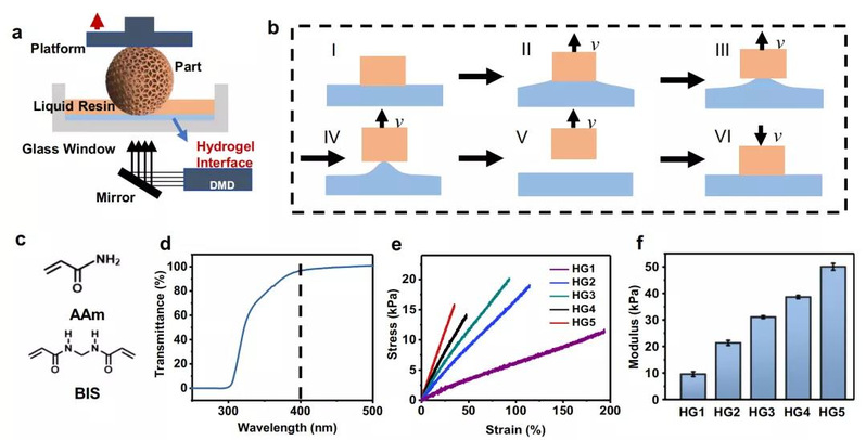 圖1. a) 以水凝膠層作為玻璃窗與液體樹脂之間的分離界面的DLP打印設(shè)備的示意圖;b) 軟變形界面上的剝離過程示意圖;c) 水凝膠單體的化學(xué)結(jié)構(gòu)式;d)由玻璃罐和水凝膠層組成的固化窗的透明度;e)不同成分水凝膠的應(yīng)力-應(yīng)變曲線;f)不同水凝膠的拉伸模量。