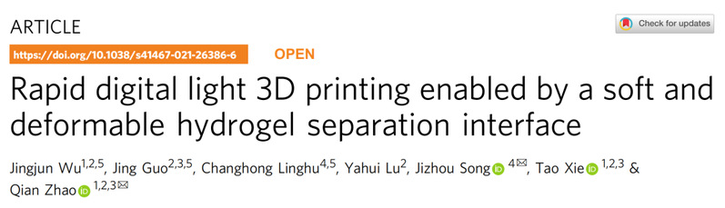 近期,浙江大學(xué)寧波研究院化工分院智能制造團(tuán)隊(duì)謝濤教授、吳晶軍助理研究員聯(lián)合浙江大學(xué)化工學(xué)院趙騫教授、浙江大學(xué)航空航天學(xué)院宋吉舟教授開創(chuàng)性地提出了以軟物質(zhì)水凝膠作為分離界面,利用該界面在厚度方向上能產(chǎn)生較大的可恢復(fù)形變,降低離型力,從而實(shí)現(xiàn)快速打?。?00 mm/h)。該研究以題為“Rapid digital light 3D printing enabled by a soft and deformable hydrogel separation interface”的論文發(fā)表在最新一期的《Nature Communications》上。