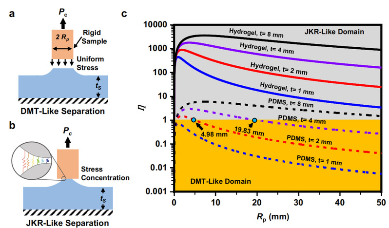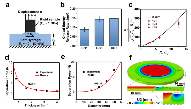 團(tuán)隊(duì)通過將力傳感器安裝到打印機(jī)的平臺(tái)上來測量實(shí)時(shí)的離型力,研究發(fā)現(xiàn):凝膠模量越低,材料越軟,離型力越??;凝膠厚度越大,沿厚度方向發(fā)生表觀位移時(shí),實(shí)際的應(yīng)變和相應(yīng)的離型力也會(huì)越小。換句話說,水凝膠模量的減小或厚度的增加,都會(huì)使應(yīng)力更加集中在打印樣品的邊緣,所需驅(qū)散裂紋傳播的負(fù)載也越小,離型力越小。而越低的離型力越有利于實(shí)現(xiàn)更高的打印速度。在此,團(tuán)隊(duì)將商用的氟化乙烯丙烯(FEP)膜與水凝膠分離界面在分離力方面進(jìn)行了對(duì)比(圖2),且將該體系的分離機(jī)理與常用的PDMS界面進(jìn)行了對(duì)比(圖3),并進(jìn)行了力學(xué)建模和分析(圖4)。
