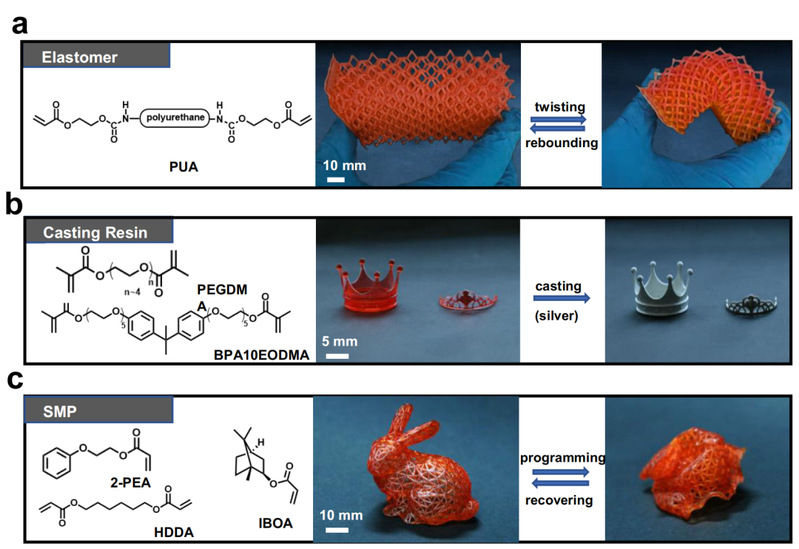 該水凝膠界面對(duì)于各種可光固化的液體樹脂具有普適性(如圖5):除了剛性的丙烯酸酯樹脂外,團(tuán)隊(duì)通過打印聚氨酯丙烯酸酯橡膠、形狀記憶聚合物(SMP)等,得到了具有多樣化功能的物體。