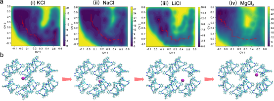 為進(jìn)一步提升離子滲透選擇性,團(tuán)隊(duì)通過界面生長策略首次構(gòu)筑了自具離散框架結(jié)構(gòu)的POC(CC3)離子分離膜,研究離子在多層次通道中的傳遞行為與分離特性。CC3是一種具有亞納米級(jí)窗口和納米級(jí)空腔的離散分子,通過窗口對(duì)窗口排列,形成由POC內(nèi)腔和POC間外腔組成的連續(xù)通道。CC3亞納米窗口可篩分一/二價(jià)離子,納米空腔為一價(jià)離子提供快速傳遞途徑,自具離散框架結(jié)構(gòu)的離子通道可降低離子與框架壁面碰撞消耗的能量,促進(jìn)離子滲透選擇性的提升。因此,CC3膜表現(xiàn)出很高的一價(jià)陽離子滲透速率(1.0 mol m?2 h?1)和極低的二價(jià)陽離子透過率,實(shí)現(xiàn)了高的離子選擇性,比如K+/Mg2+的選擇性~1031,Na+/Mg2+的選擇性~659,Li+/Mg2+的選擇性~283(圖1)。通過分子動(dòng)力學(xué)模擬計(jì)算了離子在通道中遷移的自由能面,揭示了離子在離散CC3框架通道中的傳輸路徑(圖2a)。離子在CC3通道中由一個(gè)外腔傳遞到另一個(gè)外腔過程,以不同的水合狀態(tài)通過CC3的窗口從外腔向內(nèi)腔遷移,傳遞的能壘順序?yàn)椋篕+ < Na+ <Li+ << Mg2+(圖2b)。這項(xiàng)工作揭示了離子在POC離散框架通道中的傳遞特性,為開發(fā)高離子滲透選擇性分離膜提供了理論指導(dǎo)。