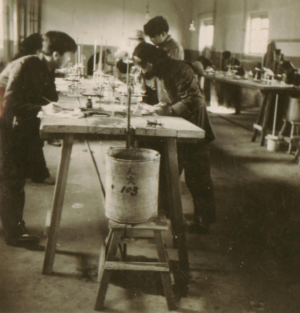 建系之初的條件極為艱苦,當(dāng)時(shí),化學(xué)系只占有一幢日偽時(shí)期建的小樓的一層。全系只有幾間很小的辦公室,二十幾名教職工擠在一起辦公,教師的數(shù)量大約只相當(dāng)于北大一個(gè)教研室的人數(shù)。實(shí)驗(yàn)設(shè)備、儀器、藥品都無(wú)從談起。第一屆學(xué)生做化學(xué)實(shí)驗(yàn)的地方是在地下室里。同學(xué)們圍著一張木板條做成的長(zhǎng)條桌,用墨水瓶做酒精燈,用水桶做上下水,用極為簡(jiǎn)單的儀器,進(jìn)行著最基本的化學(xué)實(shí)驗(yàn)……