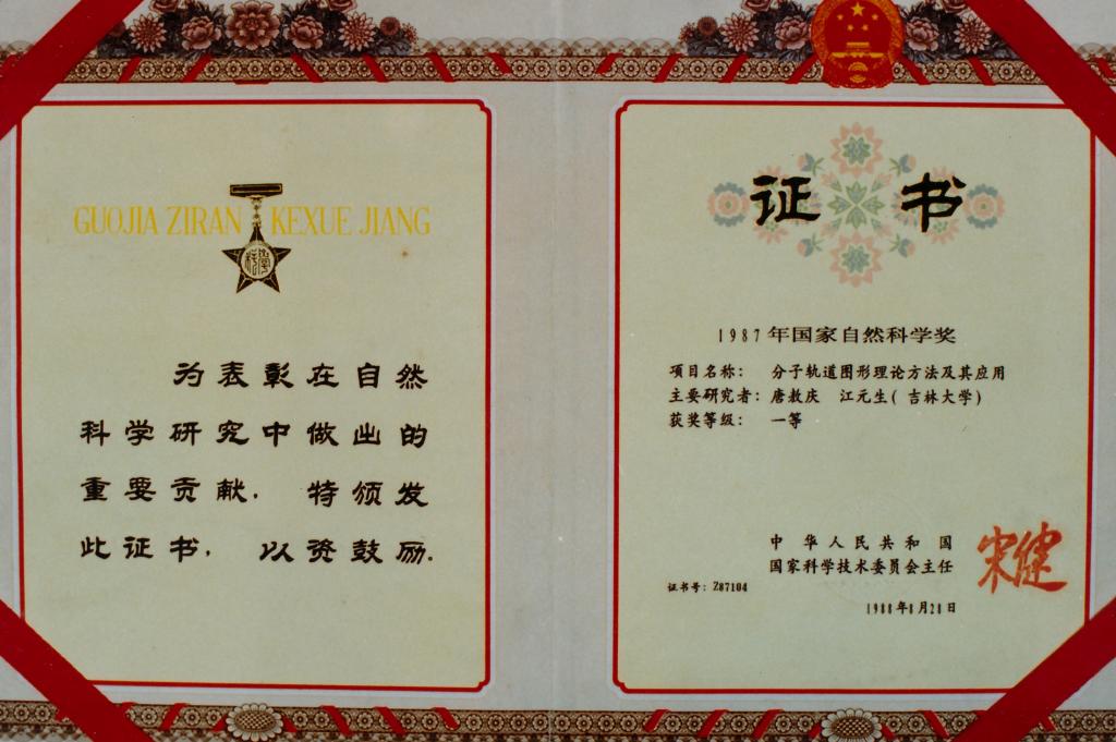 圖20:唐敖慶等人獲1987年國(guó)家自然科學(xué)獎(jiǎng)一等獎(jiǎng)證書(shū)