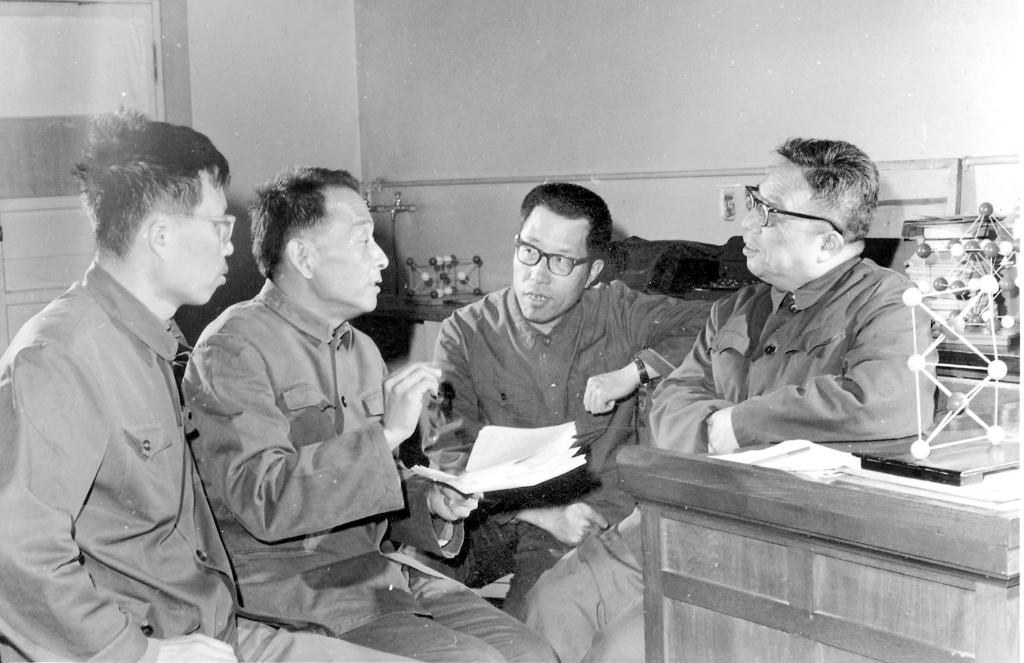 圖22:唐敖慶(右1)帶領(lǐng)孫家鐘(左2)等開(kāi)展原子簇化合物結(jié)構(gòu)規(guī)則的研究