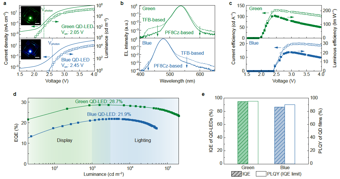圖2 高性能綠光、藍(lán)光量子點(diǎn)發(fā)光二極管