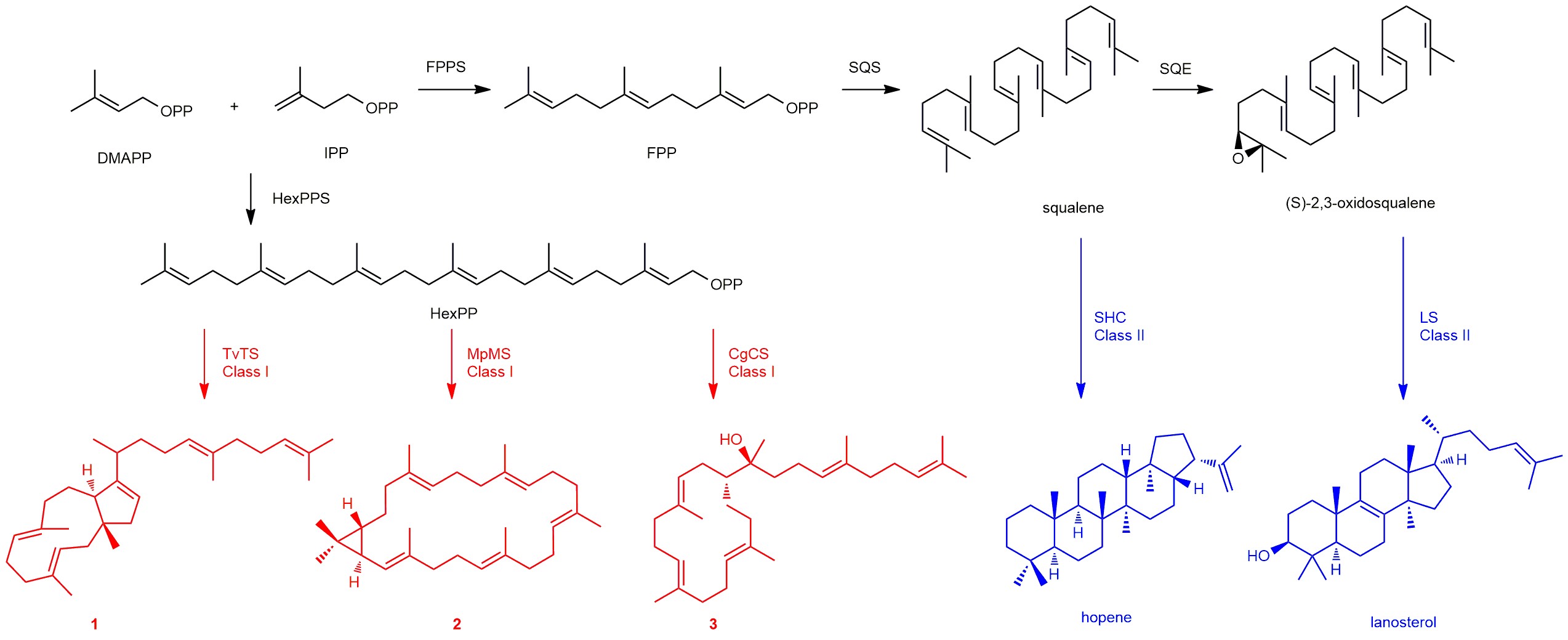 三萜化合物是具有廣泛生物活性的一大類天然產(chǎn)物,已有兩萬多種被先后發(fā)現(xiàn),成藥四百多種,包括臨床上廣泛使用的眾多重要的甾體激素類藥物和人參皂苷等天然產(chǎn)物,在保障人類健康和提高生活質(zhì)量方面發(fā)揮著不可替代的作用。由于兩萬多種該類產(chǎn)物已被發(fā)現(xiàn),其合成機(jī)理的傳統(tǒng)認(rèn)知已經(jīng)長(zhǎng)期固化:三萜化合物始于角鯊烯合酶催化兩分子法尼基焦磷酸形成角鯊烯,進(jìn)一步氧化生成環(huán)氧角鯊烯,而后三萜合酶負(fù)責(zé)催化角鯊烯或環(huán)氧角鯊烯環(huán)化形成霍烯或羊毛甾醇,龐大的結(jié)構(gòu)多樣性則是由眾多不同的修飾酶催化而成。