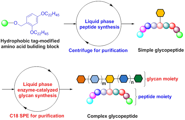 研究團(tuán)隊(duì)組合疏水標(biāo)簽協(xié)助的液相多肽合成技術(shù)和酶催化的聚糖合成方法,實(shí)現(xiàn)了液相中復(fù)雜糖肽的制備。疏水標(biāo)簽有助于促進(jìn)液相肽鏈的延伸和產(chǎn)物的快速分離;去除疏水標(biāo)簽后,在水相中加入一系列糖基轉(zhuǎn)移酶進(jìn)行高效的酶促糖鏈延伸,形成的糖肽產(chǎn)物能夠通過C18固相萃?。⊿PE)快速純化,進(jìn)而實(shí)現(xiàn)復(fù)雜糖肽的制備。該策略克服了固相合成難以監(jiān)測每一步反應(yīng)進(jìn)程和需要消耗過量復(fù)雜糖氨基酸模塊的問題,實(shí)現(xiàn)了21種復(fù)雜糖肽(16種不同聚糖修飾的9-mer糖肽、4種腫瘤相關(guān)的20-mer MUC1糖肽及1種糖基化修飾的31-mer胰高血糖素樣肽-1)的高效合成。