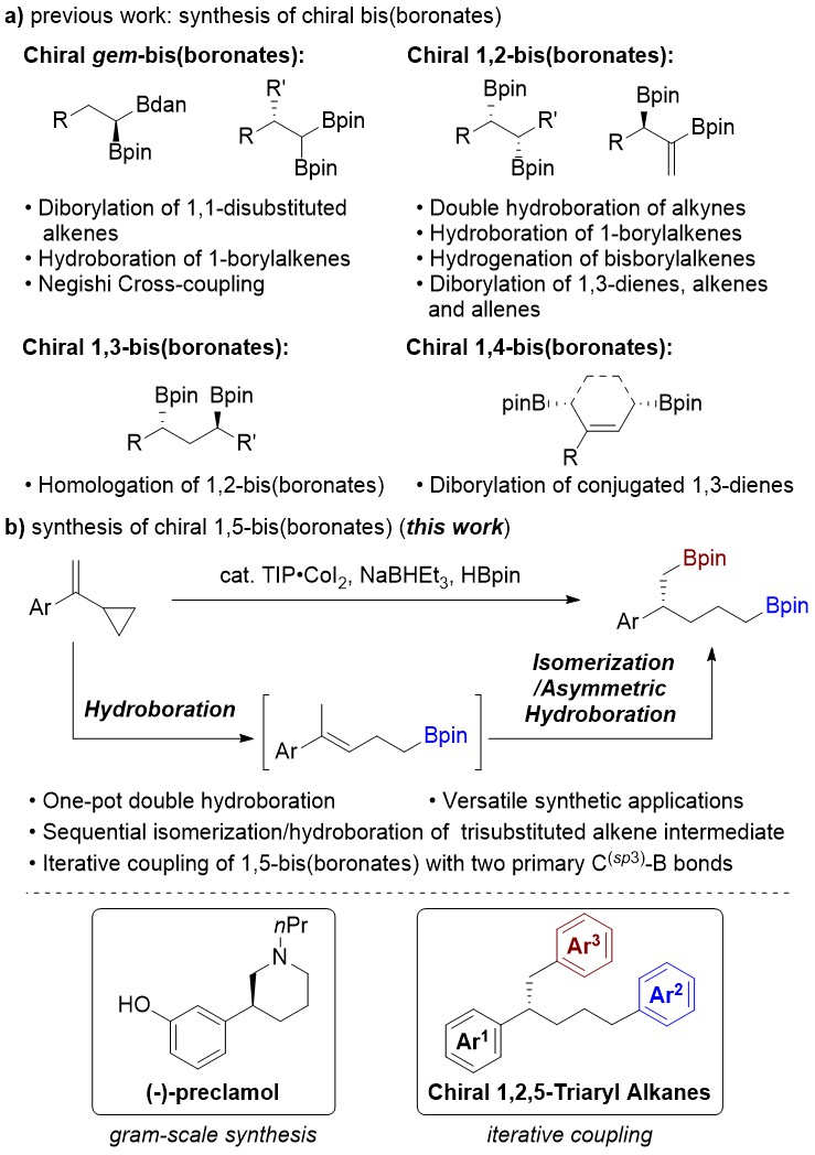 近日,陸展課題組和洪鑫課題組合作,利用一種自主設(shè)計(jì)的三功能鈷催化劑——噻唑啉亞胺吡啶(TIP)碘化鈷絡(luò)合物,實(shí)現(xiàn)了烯基環(huán)丙烷的不對(duì)稱串聯(lián)硼氫化/異構(gòu)化/硼氫化反應(yīng),合成了高對(duì)映選擇性的手性1,5-二硼化合物。基于合成的手性1,5-二硼化合物,作者可以通過(guò)簡(jiǎn)單的化學(xué)轉(zhuǎn)化克級(jí)規(guī)模合成市售抗精神病藥物丙克拉莫,同時(shí)可以通過(guò)逐級(jí)偶聯(lián)反應(yīng)構(gòu)建1,2,5-三芳基戊烷類化合物。