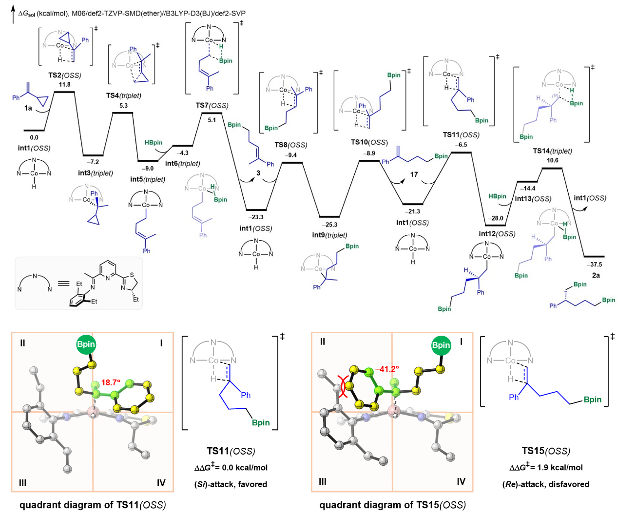 作者接著通過(guò)理論計(jì)算闡明了該反應(yīng)的機(jī)理(圖4)。噻唑啉亞胺吡啶(TIP)碘化鈷催化劑在三乙基硼氫化鈉的作用下形成鈷氫活性中間體,該活性中間體催化了第一次硼氫化反應(yīng)、異構(gòu)化反應(yīng)和第二次硼氫化反應(yīng)。中間體1,1-二取代烯烴17與鈷氫活性中間體的插入反應(yīng)是反應(yīng)的手性決定步。在該過(guò)程中,催化劑噻唑啉上的手性基團(tuán)以及2,6-二乙基苯基占據(jù)了象限圖的第II、III、IV象限,同時(shí)中間體17的芳基與催化劑的2,6-二乙基苯基在第II象限存在位阻,這使得反應(yīng)更傾向于生成R構(gòu)型的產(chǎn)物。