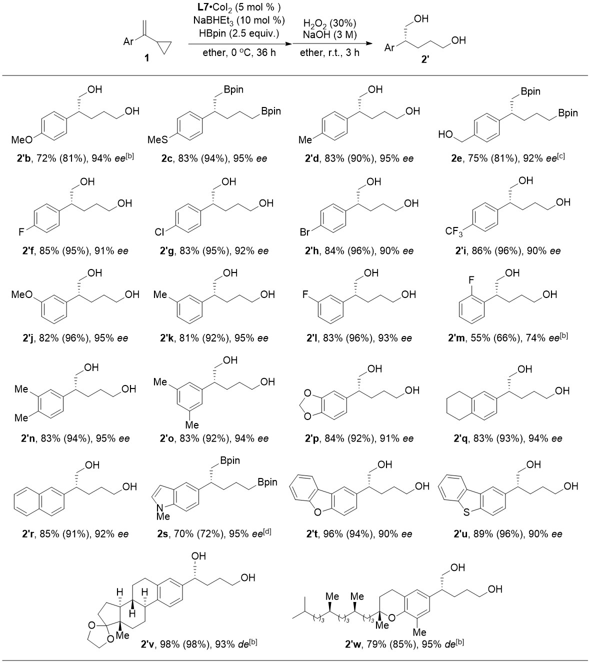 經(jīng)過(guò)條件優(yōu)化,作者對(duì)2-芳基烯基環(huán)丙烷底物的范圍進(jìn)行了考察。結(jié)果表明,反應(yīng)對(duì)于單取代、多取代的芳基、雜芳基以及天然產(chǎn)物修飾的底物都能取得較好的結(jié)果,以優(yōu)秀的對(duì)映選擇性得到手性1,5-二硼化合物(圖2)。
