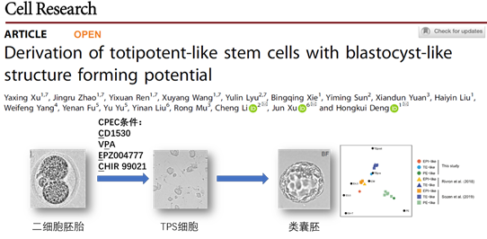 2022年5月4日,北京大學(xué)生命科學(xué)學(xué)院、生命聯(lián)合中心鄧宏魁課題組與李程課題組、北京大學(xué)醫(yī)學(xué)部基礎(chǔ)醫(yī)學(xué)院徐君課題組在Cell Research雜志上發(fā)表了題為“Derivation of totipotent-like stem cells with blastocyst-like structure forming potential”的研究論文。該研究通過(guò)化學(xué)小分子篩選組合,建立了一個(gè)新的全能性干細(xì)胞培養(yǎng)條件,可以支持從小鼠二細(xì)胞胚胎及擴(kuò)展型多能干細(xì)胞(EPS細(xì)胞)建立全能性干細(xì)胞系。這種新型全能性干細(xì)胞可在體外長(zhǎng)期穩(wěn)定培養(yǎng),在分子特征和發(fā)育潛能上與小鼠二細(xì)胞胚胎高度相似,并且可以在體外被誘導(dǎo)形成在轉(zhuǎn)錄組水平上類似于體內(nèi)囊胚的類囊胚結(jié)構(gòu)。