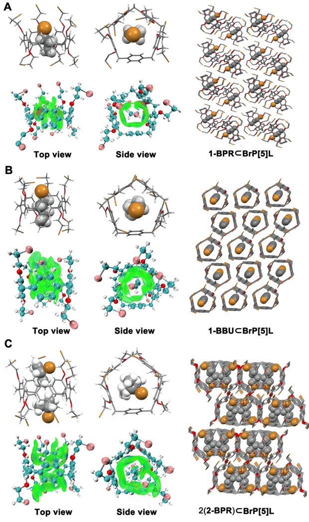 圖二:A-C,BrP[5]L分別與1-溴丙烷、1-溴丁烷以及2-溴丙烷的晶態(tài)主客體絡(luò)合結(jié)構(gòu)