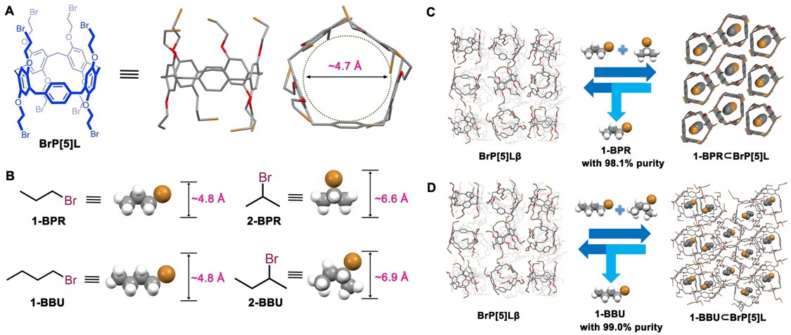 圖一:A,B,精巧型柱[5]芳烴衍生物BrP[5]L以及1-溴丙烷、2-溴丙烷、1-溴丁烷以及2-溴丁烷的分子結(jié)構(gòu);C,D,利用BrP[5]L無定形材料實(shí)現(xiàn)鹵代烴異構(gòu)體高選擇性吸附分離示意圖。