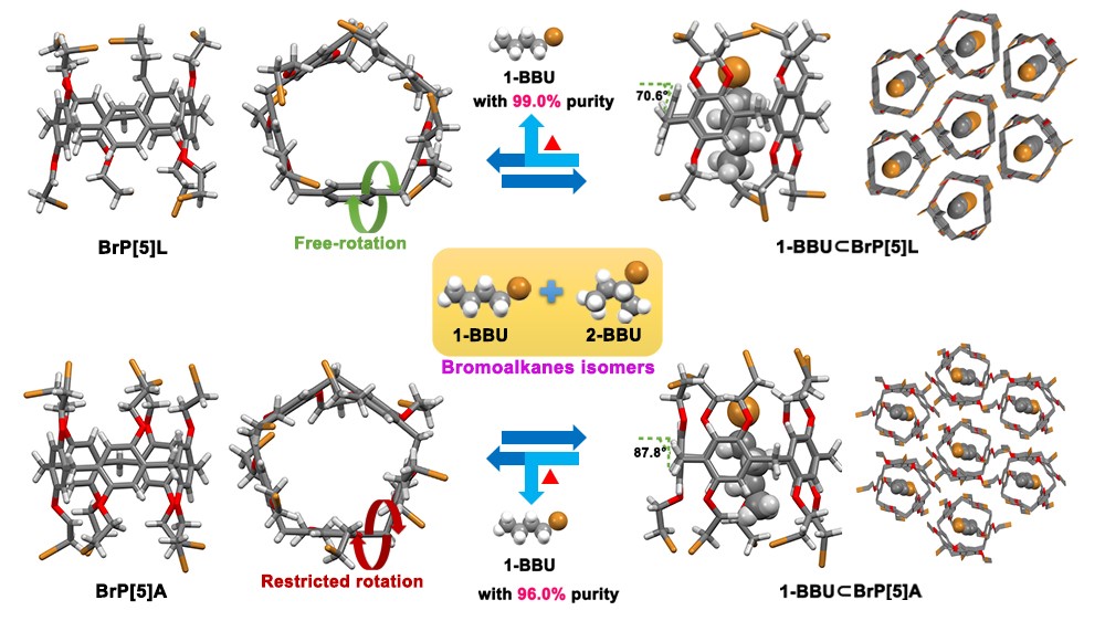 在前期的工作中,該課題組設(shè)計(jì)合成了一例“骨架精簡(jiǎn)版的”甲基柱[5]芳烴衍生物,即精巧型甲基柱[5]芳烴(permethylated leggero pillar[5]arene),并進(jìn)一步在固相條件下實(shí)現(xiàn)了對(duì)其分子堆積從無序到有序(無定形態(tài)至晶態(tài))的精準(zhǔn)調(diào)控(J. Am. Chem. Soc.2021,143, 20395)。在此研究工作基礎(chǔ)之上,該課題組成功設(shè)計(jì)并合成了一種全溴乙基取代的精巧型柱[5]芳烴衍生物(perbromoethylated leggero pillar[5]arene,簡(jiǎn)稱為BrP[5]L),隨后通過客體誘導(dǎo)的方式實(shí)現(xiàn)了對(duì)其固相分子堆積從無序到有序的精準(zhǔn)調(diào)控并同時(shí)利用該過程實(shí)現(xiàn)了對(duì)鹵代烴位置異構(gòu)體的高精準(zhǔn)式吸附與分離應(yīng)用(圖一)。實(shí)驗(yàn)結(jié)果表明,無定形且無孔的BrP[5]L粉末可以通過固相主客體相互作用來吸附多種溴代烷烴蒸汽(1-溴丙烷、2-溴丙烷、1-溴丁烷以及2-溴丁烷),進(jìn)而構(gòu)筑得到多種溴代烷絡(luò)合形式的有序超分子組裝體。同時(shí),作者發(fā)現(xiàn)1-溴代烷和2-溴代烷與BrP[5]L之間所形成的固相主客體絡(luò)合結(jié)構(gòu)具有不同的鍵合模式以及熱力學(xué)穩(wěn)定性差異,這使得無定形BrP[5]L粉末在1-/2-溴代烷烴位置異構(gòu)體的吸附分離方面展現(xiàn)出了巨大的應(yīng)用潛力。