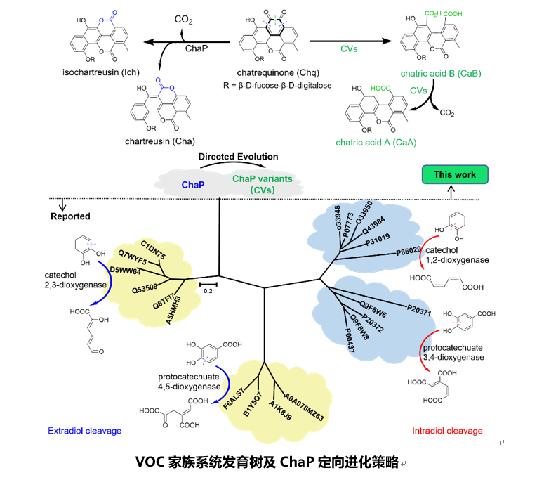 鄰氧螯合(VOC)家族酶可催化多種反應(yīng)。其中,雙加氧酶如外二醇雙加氧酶(EDOs)、內(nèi)二醇雙加氧酶(IDOs)可以催化芳香族化合物的環(huán)裂解,在好氧生物降解中發(fā)揮關(guān)鍵作用,對(duì)于維持全球碳循環(huán)以及環(huán)境保護(hù)具有重要意義。但目前為止,仍缺乏一個(gè)合適的平臺(tái)來(lái)調(diào)控此類雙加氧酶的反應(yīng)類型,尤其對(duì)于鄰苯醌代謝通路的反應(yīng)軌跡,研究甚少。