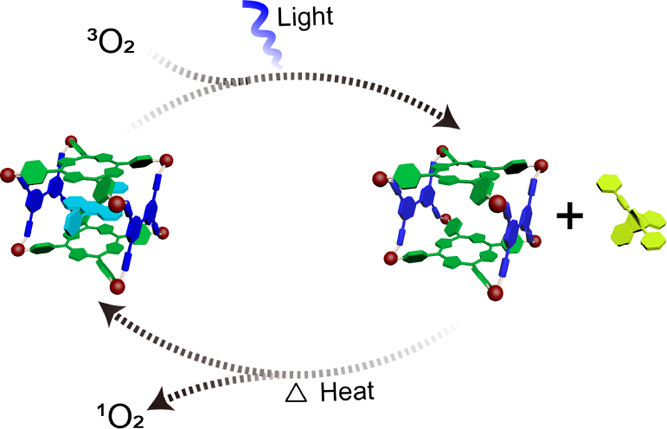 針對(duì)這一問題,西安交通大學(xué)材料學(xué)院的張明明課題組利用四羧酸聯(lián)苯與四吡啶卟啉作為構(gòu)筑基元,通過Pt基配體的連接構(gòu)筑了桶狀的卟啉基金屬有機(jī)籠。這種多齒配體的螯合配位利用金屬配位鍵的協(xié)同性大大提高了其結(jié)構(gòu)的穩(wěn)定性,為其功能的研究與拓展奠定了基礎(chǔ)。值得指出的是,在該結(jié)構(gòu)中兩個(gè)卟啉分子之間的距離為8.0 Å,有利于通過π -π堆積作用來有效地識(shí)別多環(huán)芳烴類分子。當(dāng)蒽的衍生物作為客體分子時(shí),該金屬有機(jī)籠在光照下可以有效地產(chǎn)生單線態(tài)氧用以氧化其內(nèi)部包裹的客體分子,進(jìn)而破壞蒽衍生物的平面結(jié)構(gòu),使得其主客體結(jié)合能力大大下降,從而在金屬籠的空腔里被釋放出來。進(jìn)一步加熱該體系會(huì)使得氧化的客體分子釋放出單線態(tài)氧回到其初始狀態(tài),進(jìn)而被重新包裹到金屬籠的空腔內(nèi)。這種通過光氧化驅(qū)動(dòng)的客體的可逆封裝與釋放過程有望被用于構(gòu)建新型的刺激響應(yīng)性材料。