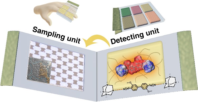 目前,烏洛托品的檢測已逐漸擺脫笨重、耗時(shí)的實(shí)驗(yàn)室儀器的使用而轉(zhuǎn)向開發(fā)便攜式和快速傳感策略,如表面增強(qiáng)拉曼光譜、熒光和比色法。然而,現(xiàn)有方法在處理安全性和實(shí)用性方面缺乏考慮,尤其是在提高便攜性、操作簡易性、取樣效率和傳感試劑的安全性對(duì)攜帶和儲(chǔ)存所帶來的不便,甚至對(duì)被分析物表面造成不同程度的損傷。針對(duì)上述問題,中國科學(xué)院新疆理化技術(shù)研究所爆炸物傳感檢測團(tuán)隊(duì)開發(fā)了一種準(zhǔn)確、抗干擾、溫和且便攜的方法,提出了一體化的烏洛托品現(xiàn)場可視化檢測設(shè)計(jì)方案,將采樣單元和檢測單元結(jié)合集成為“口袋傳感芯片(chip-in-pocket)”,實(shí)現(xiàn)了對(duì)烏洛托品的快速、高靈敏、無死角比色檢測。