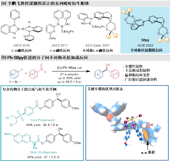 課題組通過藥物合成中常見的羰基加成反應(yīng)展示了SBpy設(shè)計的合理性與有效性。目前,當(dāng)量金屬試劑對羰基的不對稱加成發(fā)展成熟,但以易得的鹵化物為原料實現(xiàn)該轉(zhuǎn)化則更具經(jīng)濟(jì)性和普適性。以二苯甲酮衍生的Ph-SBpy為配體,課題組首次實現(xiàn)了分子間芳基鹵化物對芳基醛的不對稱加成反應(yīng)。該反應(yīng)催化活性高,條件溫和,大多數(shù)底物均取得了優(yōu)秀的收率和對映選擇性,成功應(yīng)用于復(fù)雜藥物的合成與衍生化,為手性分子的立體選擇性合成提供了新工具。研究表明,Ph-SBpy既具有富電子配體骨架,又使近程空間位阻最小化,且側(cè)鏈基團(tuán)也可保證活性催化劑的穩(wěn)定性。因此,SBpy在低溫下仍可“活性不打折”地實現(xiàn)優(yōu)異的立體選擇性。結(jié)合通過密度泛函理論,課題組得到了立體選擇性關(guān)鍵步驟的優(yōu)勢過渡態(tài)結(jié)構(gòu),其中反應(yīng)物芳基和與配體的苯基之間存在π–π堆積作用,進(jìn)一步解釋了Ph-SBpy比其它富電子、低位阻聯(lián)吡啶配體活性更高的原因。