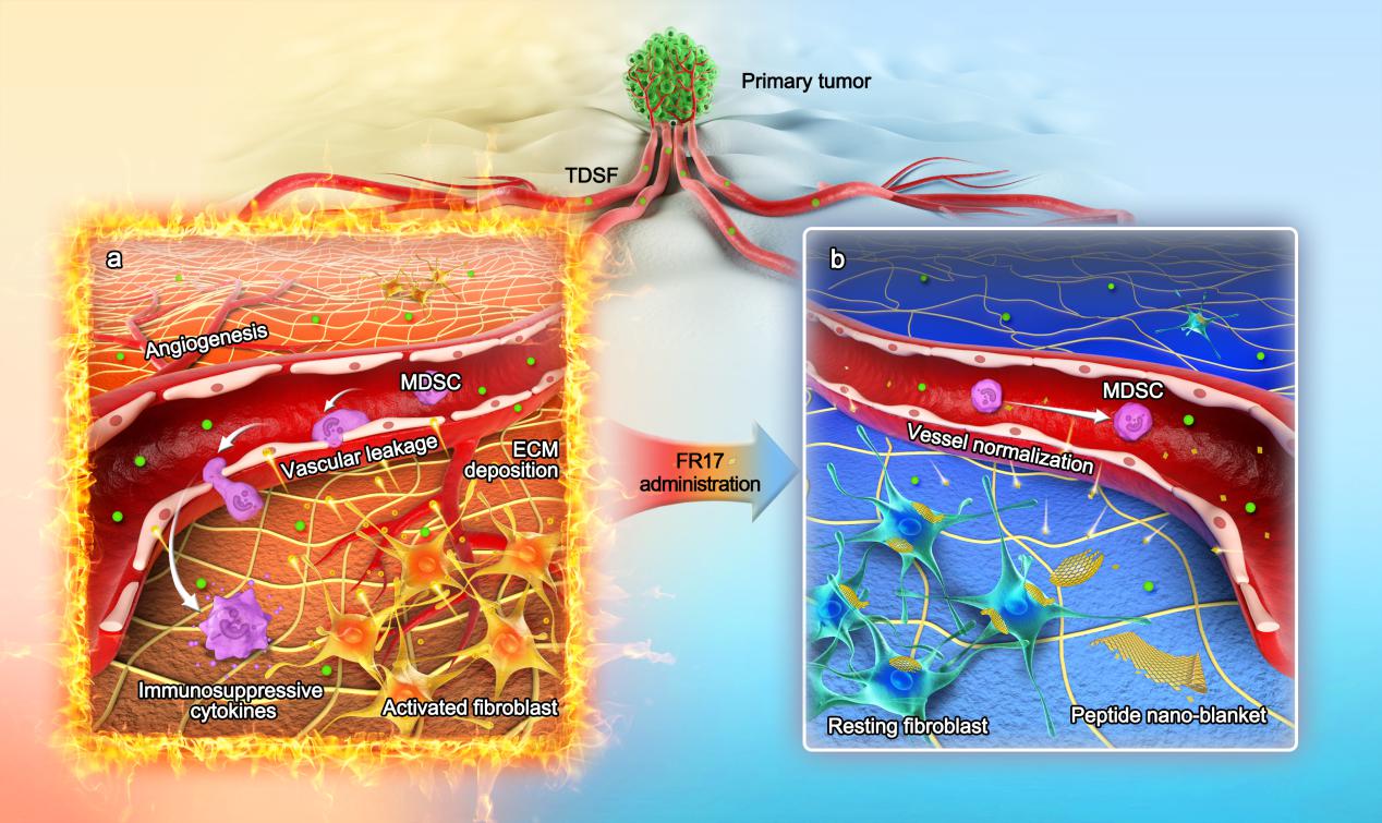 圖2.論文示意圖:“多肽納米毯”通過抑制成纖維細(xì)胞的激活,遏制轉(zhuǎn)移前微環(huán)境的發(fā)展形成