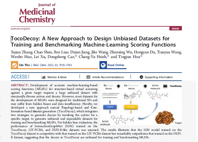 2022年6月,浙江大學(xué)藥學(xué)院侯廷軍教授團(tuán)隊(duì)、中南大學(xué)曹東升教授團(tuán)隊(duì)和騰訊量子實(shí)驗(yàn)室聯(lián)合在《Journal of Medicinal Chemistry》上發(fā)表論文“TocoDecoy: A New Approach to Design Unbiased Datasets for Training and Benchmarking Machine-Learning Scoring Functions”,提出了一種用于機(jī)器學(xué)習(xí)打分函數(shù)訓(xùn)練和測(cè)試的無(wú)偏數(shù)據(jù)集構(gòu)建新方法。該方法引入四種技巧來(lái)消除隱藏偏差,給定特定靶標(biāo)的活性分子,基于條件分子生成和分子對(duì)接,可以基于已知的活性分子高效地生成相應(yīng)的負(fù)樣本(decoys),為機(jī)器學(xué)習(xí)打分函數(shù)的訓(xùn)練和測(cè)評(píng)提供了無(wú)偏的數(shù)據(jù)集。