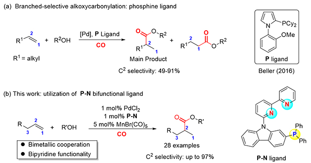 長鏈脂肪烯烴是一種來源廣泛、品類豐富的化學品,可被轉化為各種具有生物活性的化合物和重要的醫(yī)藥中間體。在過去的半個世紀中,具有直鏈選擇性的烯烴(反馬爾科夫尼科夫規(guī)則)羰基化反應催化體系發(fā)展比較迅速。其中,很多反應體系已成功應用于工業(yè)生產(chǎn)中。相比之下,研究長鏈脂肪族烯烴的支鏈選擇性的(馬爾科夫尼科夫規(guī)則)烷氧羰基化反應催化體系比較少。脂肪族支鏈酯類化合物在制藥、高分子材料、香料等領域有著廣泛的應用。因此,開發(fā)一種通用的、高支鏈選擇性的適合長鏈脂肪族烯烴的烷氧羰基化反應體系具有重要意義。