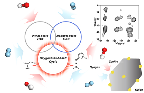 本工作中,研究人員利用ZnAlOx/H-ZSM-5模型催化體系,借助準(zhǔn)原位ssNMR-GC的檢測方法,追蹤了包括表面多碳羧酸鹽、多碳烷氧基、BAS吸附環(huán)戊烯酮、環(huán)戊烯基碳正離子在內(nèi)豐富的中間體的動態(tài)演化過程,建立了從初始碳碳鍵生成到穩(wěn)態(tài)轉(zhuǎn)化—催化劑內(nèi)部中間體與氣相產(chǎn)物對應(yīng)關(guān)系的反應(yīng)階段,揭示了含氧化合物中間體到烯烴及芳烴產(chǎn)物的反應(yīng)路徑,論證了CO和H2參與含氧化合物路徑并在二次反應(yīng)中起重要作用的觀點。除模型催化體系外,研究人員在多種OXZEO催化劑上均觀測到了關(guān)鍵中間體,驗證了之前提出的包括含氧化合物路徑在內(nèi)反應(yīng)機(jī)理的普適性。