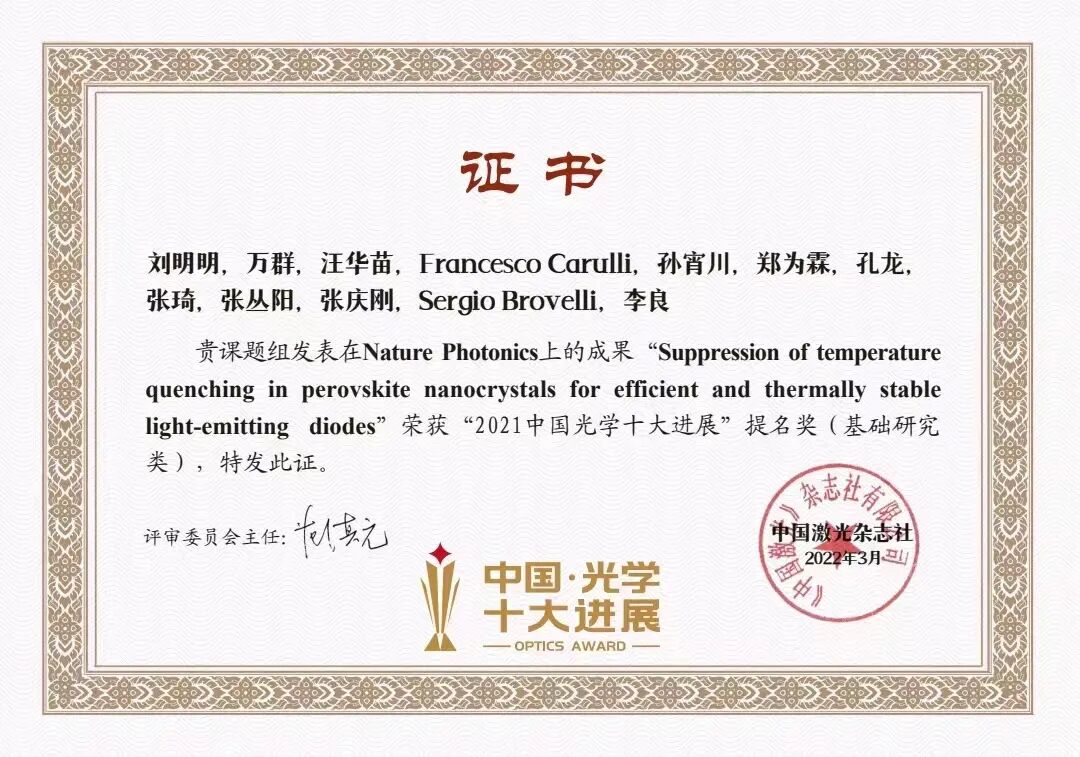 3. Liu M, Wan Q, Wang H, et al. Suppression of temperature quenching in perovskite nanocrystals for efficient and thermally stable light-emitting diodes[J]. Nature Photonics, 2021, 15(5): 379-385.