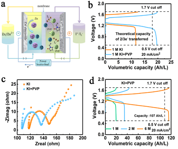 圖2. 鋅碘液流電池示意圖以及不同濃度正極電解液的恒流電壓-容量曲線。