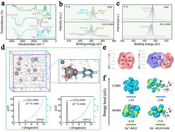 圖3. (a)NAM、ZnCl2和ZnCl2-NAM的紅外光譜;(b-c)ZnCl2和ZnCl2-NAM的高分辨率XPS N 1s和O 1s光譜;(d)ZnCl2-NAM的分子動力學(xué)模型,Zn2+-N (NAM)和Zn2+-O (NAM)的徑向分布函數(shù);(e)Zn2+-6H2O(左)和Zn2+-4H2O-NAM(右)溶劑化結(jié)構(gòu)的靜電勢圖;(f)LUMO和HOMO等值面