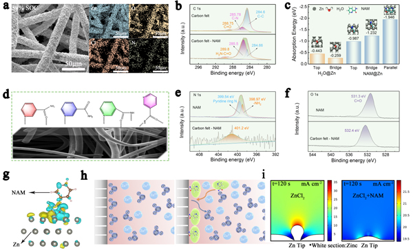 圖4. (a)0.5 M ZnCl2+0.05 M NAM溶液中鍍鋅碳?xì)值男蚊埠虴DX元素圖;(b)原始碳?xì)趾蚇AM吸附的碳?xì)值母叻直媛蔢PS C 1s光譜;(c)Zn (002)平面吸附能比較;(d)NAM在碳纖維上的吸附位點示意圖;(e-f)NAM和NAM吸附的碳?xì)值母叻直媛蔢PS N 1s和O1s光譜;(g)吸附在Zn (002)平面上的NAM的差分電荷密度;(h)引入NAM前后的電極/溶液界面示意圖;(i)ZnCl2(左)和ZnCl2-NAM(右)中Zn2+通量分布的數(shù)值模擬。