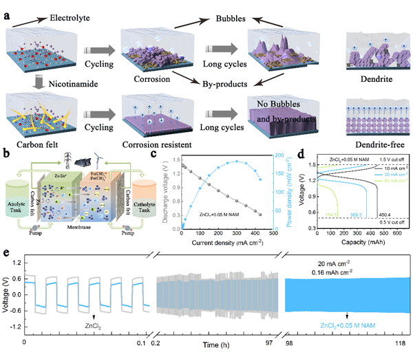 圖5. (a)NAM對鋅沉積的影響示意圖;(b)基于NAM的鋅鐵液流電池的示意圖;(c)使用0.5 M ZnCl2+ 0.05 M NAM負(fù)極電解液的鋅鐵液流電池放電極化曲線和功率密度曲線;(d)20 mA cm-2下電池的恒電流電壓曲線; (e)Zn//Zn對稱電池的長期恒流充放電比較。