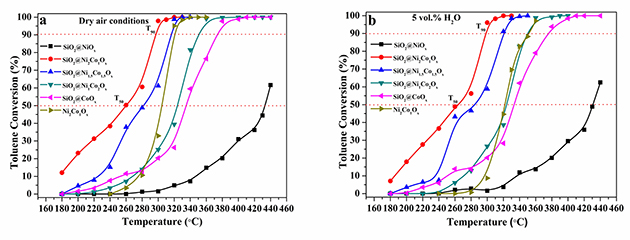 圖2 核殼SiO2@NiaCobOx催化劑的VOCs催化氧化性能