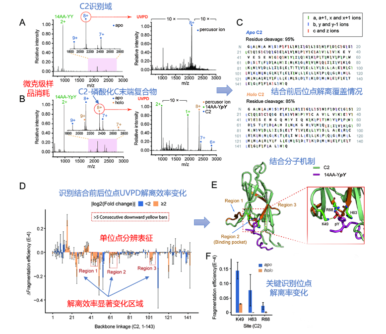 免疫共受體CD28是癌癥免疫治療的重要靶點(diǎn),其胞質(zhì)端酪氨酸磷酸化激活引起的下游蛋白識(shí)別結(jié)合機(jī)制尚不清楚。本工作中,研究人員采用光親和質(zhì)譜法發(fā)現(xiàn)CD28磷酸化胞質(zhì)端與激酶PKCθ的C2結(jié)構(gòu)域特異性結(jié)合;利用193nm紫外激光解離質(zhì)譜對(duì)C2結(jié)合前后進(jìn)行了全序列覆蓋位點(diǎn)光解離效率的差異分析,發(fā)現(xiàn)了光解離效率顯著下降的三個(gè)關(guān)鍵結(jié)合區(qū)域和核心識(shí)別位點(diǎn)K49、H63、R68;證明了高能紫外激光解離策略在蛋白質(zhì)動(dòng)態(tài)識(shí)別結(jié)構(gòu)變化分析中的高靈敏度和單位點(diǎn)分辨高精度優(yōu)勢(shì)。