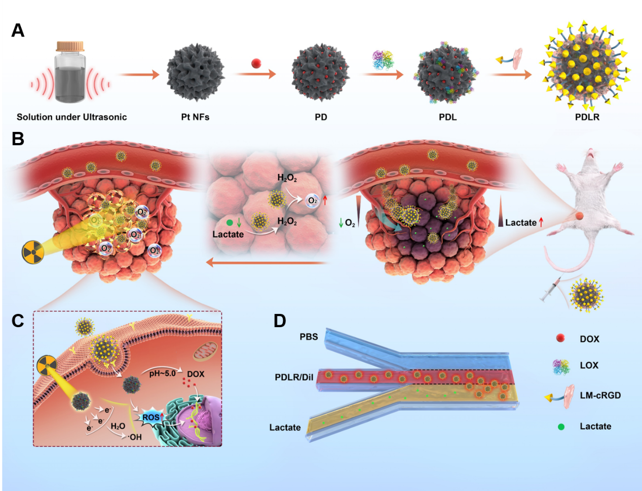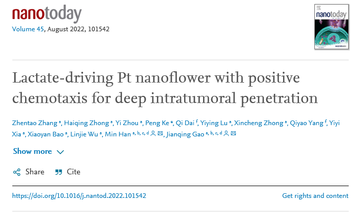 基于腫瘤微環(huán)境具有高濃度乳酸的特征,研究團(tuán)隊(duì)采用乳酸氧化酶(LOX)修飾多功能鉑(Pt)納米粒,構(gòu)建了一種具有乳酸驅(qū)動定向趨化性和級聯(lián)催化產(chǎn)氧作用的多功能放療增敏劑,有效促進(jìn)腫瘤內(nèi)部小劑量放療增敏作用,并初步驗(yàn)證了其具有向乳酸溶液側(cè)偏移和腫瘤內(nèi)部滲透的定向移動行為,為基于腫瘤微環(huán)境特性開發(fā)酶底物濃度梯度驅(qū)動的納米制劑定向趨化遞送和小劑量放療增敏策略提供借鑒意義,同時也為促進(jìn)藥物腫瘤內(nèi)部滲透等領(lǐng)域提供新策略。這是繼該團(tuán)隊(duì)在Nature Communications(2022 May 25;13 (1) : 2906. doi: 10.1038/s41467-022-30634-8)上發(fā)表“納米毯”抑制腫瘤轉(zhuǎn)移前微環(huán)境后在抗腫瘤領(lǐng)域的又一進(jìn)展。該研究論文的第一作者為浙江大學(xué)藥學(xué)院碩士生張振濤和仲海清,通訊作者為浙江大學(xué)藥學(xué)院高建青教授和韓旻副教授。