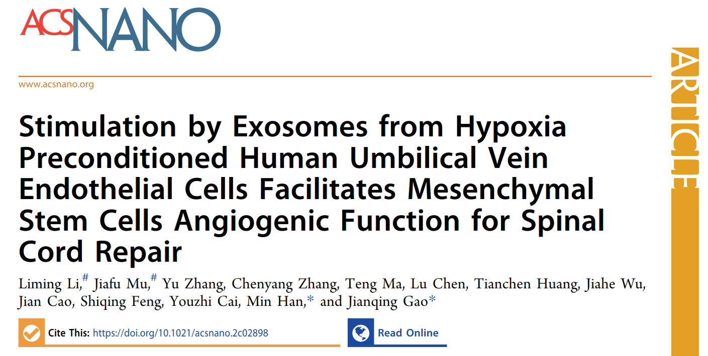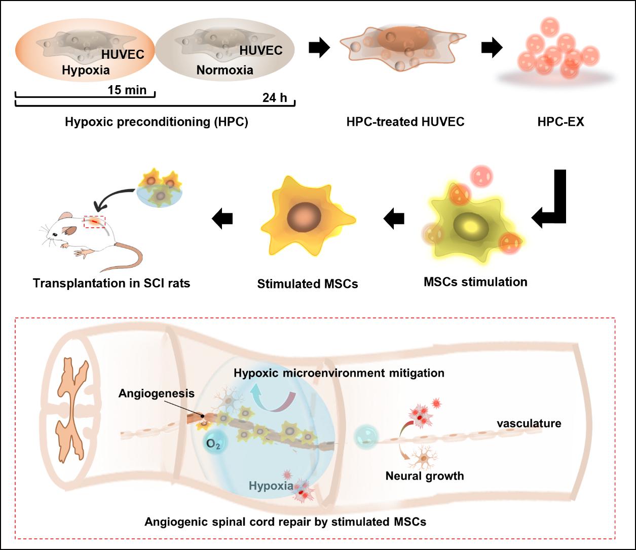 研究團(tuán)隊(duì)針對脊髓損傷的缺血微環(huán)境和成血管修復(fù)治療,基于細(xì)胞外泌體在細(xì)胞-細(xì)胞交流與細(xì)胞-微環(huán)境交流中的作用,對人臍靜脈血管內(nèi)皮細(xì)胞(HUVEC)進(jìn)行低氧預(yù)適應(yīng)(HPC)刺激并獲取其外泌體(HPC-EX),進(jìn)一步利用該外泌體調(diào)控MSC細(xì)胞成血管并進(jìn)行脊髓損傷治療。在低氧-常氧的HPC刺激中,時長僅15分鐘的低氧刺激即可使HUVEC產(chǎn)生有效促進(jìn)MSC成血管的HPC-EX,攝取HPC-EX的MSC可在2小時內(nèi)于基質(zhì)膠中顯著成管,并在植入損傷脊髓組織后促進(jìn)組織中血管生成和改善炎癥微環(huán)境,有效促進(jìn)了組織的修復(fù)和神經(jīng)功能恢復(fù)。該項(xiàng)研究為脊髓損傷組織修復(fù)治療提供了高效的促血管生成治療策略,同時也為基于外泌體和干細(xì)胞的疾病治療提供了新的啟發(fā)。該研究工作得到天津醫(yī)科大學(xué)總院骨科馮世慶教授和浙江大學(xué)醫(yī)學(xué)院附屬第一醫(yī)院骨科蔡友治教授的幫助。論文的第一作者為浙江大學(xué)藥學(xué)院博士后李黎明和博士生母佳富,通訊作者為浙江大學(xué)藥學(xué)院高建青教授和韓旻副教授,該研究受到科技部重點(diǎn)研發(fā)計(jì)劃“人臍帶間充質(zhì)干細(xì)胞修復(fù)脊髓損傷的臨床研究”的資助。