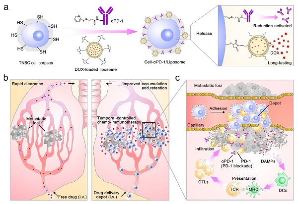 導讀:7月16日,《先進材料》(Adv Mater)以“Walking dead tumor cells for targeted drug delivery against lung metastasis of triple negative breast cancer”為題,在線發(fā)表了上海藥物所李亞平研究員、王當歌副研究員和復旦大學姜嫣嫣教授團隊合作的最新研究成果。該研究開發(fā)了一種基于滅活腫瘤細胞的載藥系統(tǒng),實現(xiàn)化療藥阿霉素(DOX)和anti-PD-1抗體在肺部及肺轉移灶的蓄積及智能釋藥,改善肺部免疫微環(huán)境并抑制肺轉移灶生長。