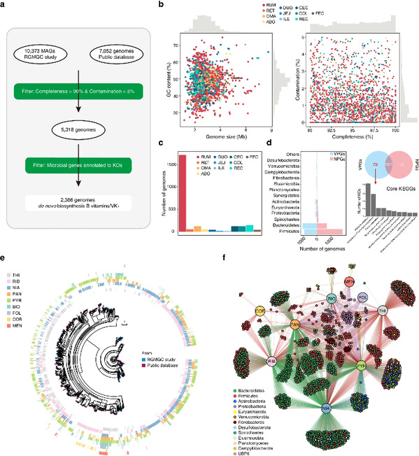 維生素是動物維持正常生理功能而必需的一類小分子化合物。在維生素家族中,B族維生素(VB)主要作為輔酶,參與動物體內(nèi)碳水化合物代謝,維生素K2(VK2)起著加速凝血和維持凝血的作用。先前研究表明,反芻動物瘤胃微生物可合成VB和VK2,但除瘤胃外的其它胃腸道區(qū)段的微生物能否合成VB和VK2?合成VB和VK2的主要胃腸道微生物種群組成有哪些?日糧結(jié)構(gòu)對胃腸道微生物介導(dǎo)的VB和VK2合成有怎樣的影響?這些問題尚不清楚。在團(tuán)隊(duì)前期構(gòu)建的反芻動物胃腸道微生物基因集和基因組集的基礎(chǔ)上(《Microbiome》“An integrated gene catalog and over 10,000 metagenome-assembled genomes from the gastrointestinal microbiome of ruminants”,2021),論文收集了已發(fā)表的7,052個反芻動物胃腸道微生物基因組;鑒定出參與VB和VK2合成的1,135,807個微生物基因和167個Kos,發(fā)現(xiàn)其中的2,366個微生物基因組含有能夠從頭合成VB和VK2的基因。論文構(gòu)建了胃腸道微生物合成VB和VK2的分子路徑,厘清了合成VB和VK2的關(guān)鍵胃腸道微生物種群結(jié)構(gòu),發(fā)現(xiàn)微生物合成的鈷胺素在胃腸道微生物和宿主互作中起著重要介質(zhì)作用。論文同時揭示了日糧結(jié)構(gòu)變化對奶牛瘤胃中VB和VK2合成的影響規(guī)律,發(fā)現(xiàn)飼喂高精料日糧顯著降低了奶牛瘤胃中鈷胺素合成相關(guān)微生物基因的總豐度。研究結(jié)果為通過靶向營養(yǎng)調(diào)控促進(jìn)反芻動物胃腸道微生物合成VB和VK2提供了理論依據(jù)。南京農(nóng)業(yè)大學(xué)動物科技學(xué)院碩士生蔣遷、博士生林麗梅、謝斐為文章的共同第一作者。毛勝勇教授、劉軍花副教授為共同通訊作者,朱偉云教授、邱強(qiáng)教授(西北工業(yè)大學(xué))、李志鵬教授(吉林農(nóng)業(yè)大學(xué))、王敏研究員(中國科學(xué)院亞熱帶農(nóng)業(yè)生態(tài)研究所)等參與了該項(xiàng)目研究,該研究得到了國家重點(diǎn)研發(fā)項(xiàng)目的支持。