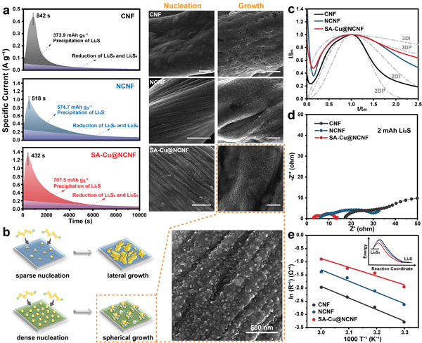 鋰硫電池具有能量密度高(2600 Wh kg-1)、硫單質(zhì)成本低廉和環(huán)境友好等優(yōu)勢(shì),在替代鋰離子電池的新一代電化學(xué)儲(chǔ)能體系中極具競(jìng)爭(zhēng)力。硫正極的容量發(fā)揮與復(fù)雜的“固-液-固”多步反應(yīng)動(dòng)力學(xué)緊密相關(guān),尤其是硫化鋰的沉積/解離過(guò)程,貢獻(xiàn)了鋰硫電池正極充放電容量的四分之三,是影響性能的重要過(guò)程。然而,硫化鋰的絕緣性導(dǎo)致了電化學(xué)過(guò)程需要克服較高反應(yīng)活化能;電化學(xué)過(guò)程中硫化鋰形成是平面生長(zhǎng),造成了電極表面的快速鈍化,從而導(dǎo)致硫化鋰的沉積/解離過(guò)程,動(dòng)力學(xué)緩慢和效率低。近年來(lái),過(guò)渡金屬基催化劑用于硫正極可有效降低反應(yīng)能壘,促進(jìn)電荷轉(zhuǎn)移,提高活性物質(zhì)的利用率,但放電過(guò)程中,產(chǎn)物硫化鋰會(huì)覆蓋催化位點(diǎn),降低后續(xù)反應(yīng)的電催化活性。電池體系中催化劑誘導(dǎo)的反應(yīng)物(產(chǎn)物)的導(dǎo)電屬性變化對(duì)性能的影響,尚未得到充分的認(rèn)識(shí)和研究。