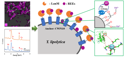 本研究首次成功將一種新型稀土結(jié)合蛋白Lanmodulin展示在真菌解脂耶氏酵母的細(xì)胞表面,構(gòu)建了廣譜高效的稀土吸附劑(LanM-displayed Y. lipolytica)(圖1)。該吸附劑對(duì)稀土元素的吸附量最高可達(dá)49.83 mg Yb /g DCW, 50.38 mg Tm /g DCW, 49.94 mg Er /g DCW和48.72 mg Tb/g DCW,且對(duì)各類稀土元素均具有很高的選擇性。此外,該吸附劑可耐受酸性環(huán)境(pH=3.0,圖2),具有很強(qiáng)的環(huán)境適應(yīng)性,可用于酸性冶礦廢水處理以實(shí)現(xiàn)稀土元素的回收利用。本研究進(jìn)一步探討了該吸附劑的吸附動(dòng)力學(xué)及等溫吸附模型特征,發(fā)現(xiàn)其吸附規(guī)律符合第一動(dòng)力學(xué)方程和Langmuir等溫吸附方程。基于FTIR和SEM-EDS分析,發(fā)現(xiàn)與稀土元素作用的基團(tuán)主要為磷酸和羧酸基團(tuán), LanM通過引入更多對(duì)稀土元素具有高選擇性的結(jié)合位點(diǎn)增強(qiáng)了吸附性能。