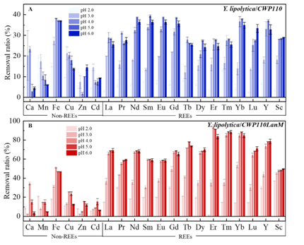 圖2 在酸性環(huán)境下吸附劑對(duì)稀土元素和非稀土元素的去除率比較。(A):對(duì)照菌(B)本研究中的工程菌