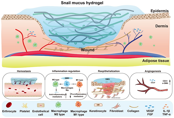 近日,該專題組從白玉蝸牛粘液中發(fā)現(xiàn)一種天然的多糖基粘合劑(dried Snail Mucus Gel, d-SMG),發(fā)現(xiàn)其對濕潤組織具有較強(qiáng)的粘附性能,優(yōu)于臨床使用的纖維蛋白膠。為了闡明d-SMG成膠性與粘附性的內(nèi)在機(jī)制,進(jìn)一步對其成分進(jìn)行了系統(tǒng)的鑒定與分析,發(fā)現(xiàn)d-SMG主要由類肝素的蝸牛糖胺聚糖與蝸牛蛋白質(zhì)等生物大分子組成,其中的新型糖胺聚糖為其主要有效活性組分;多糖與蛋白質(zhì)組成的獨(dú)特雙網(wǎng)絡(luò)凝膠體系,使得蝸牛粘液具有突出的水凝膠性能以及強(qiáng)效的組織粘附性。