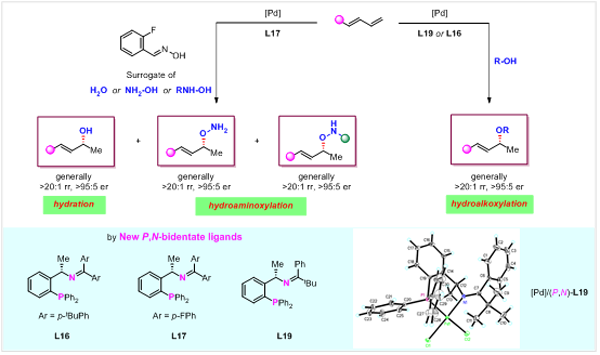 非保護(hù)的活性官能團(tuán)的高效構(gòu)建和引入,例如羥基、胺基、羥胺、胺羥、硫醇、羧酸、膦酸等具有重要意義,可以避免繁瑣的保護(hù)和脫保護(hù)的操作。且此類基團(tuán)還可以直接地進(jìn)行大量的衍生化。但顯然,由于非保護(hù)活性基團(tuán)難以控制的配位、競爭性轉(zhuǎn)化、不穩(wěn)定性、溶解性等問題,嚴(yán)重阻礙了相關(guān)的研究。另一方面,針對(duì)共軛二烯的不對(duì)稱氫官能團(tuán)化方法的開發(fā)雖然取得了許多突破,可以實(shí)現(xiàn)不同類型手性中心的構(gòu)建,包括C-N、C-C、C-S、C-P、C-Si等,但C-O鍵的構(gòu)建一直無法突破。這主要是由于氧基親核試劑的弱的親核性以及產(chǎn)物的不穩(wěn)定性所造成的。基于此,我們通過改良并合成了新的P,N-雙齒配體,高效地實(shí)現(xiàn)鈀催化共軛二烯的不對(duì)稱氫烷氧基化反應(yīng)。該反應(yīng)對(duì)于不同的烷基醇及芳基或烷基取代的二烯,均能夠很好的兼容,觀察到中等到良好的收率,~90% ee以及高的區(qū)域選擇性。隨后,基于該類配體,通過利用氟代芳醛衍生的肟作為親核試劑,再串聯(lián)消除、水解或還原等過程,便可以實(shí)現(xiàn)形式的不對(duì)稱水合反應(yīng)和氫胺羥化反應(yīng),從而將簡單的共軛二烯直接轉(zhuǎn)化得到非保護(hù)的烯丙醇和烯丙基羥胺骨架。尤其是對(duì)于手性的烯丙基羥胺片段,目前尚未有高效的合成方法報(bào)道。
