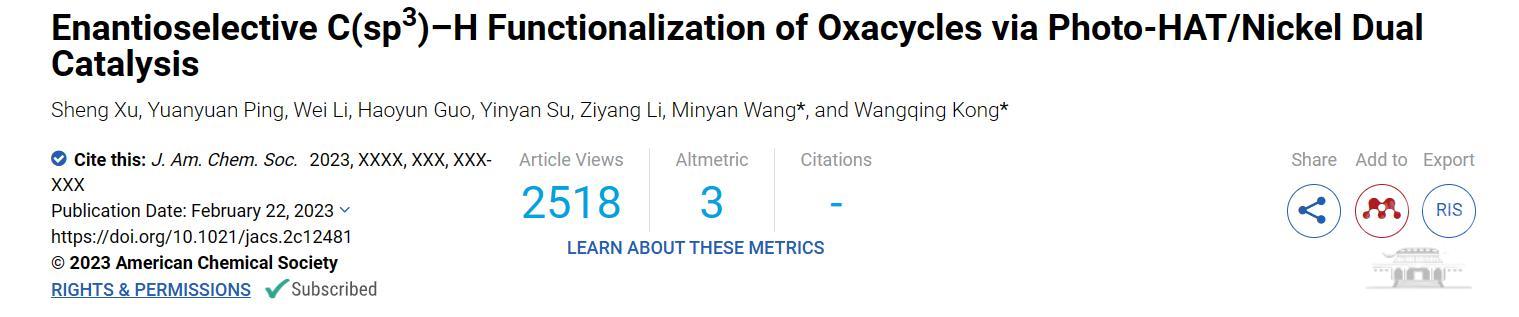 2月22日,Journal of the American Chemical Society《美國化學(xué)會志》在線發(fā)表了高等研究院孔望清教授課題組在光-HAT/鎳協(xié)同催化C(sp3)-H不對稱轉(zhuǎn)化研究的最新研究成果,論文題為“Enantioselective C(sp3)–H Functionalization of Oxacycles via Photo-HAT/Nickel Dual Catalysis”(《 光鎳協(xié)同催化實現(xiàn)氧雜環(huán)C(sp3)-H對映選擇性官能團(tuán)化反應(yīng)》)。高等研究院2018級直博生許盛為第一作者,高等研究院孔望清教授和南京大學(xué)王敏燕教授為論文的共同通訊作者,高等研究院為論文的第一署名單位。