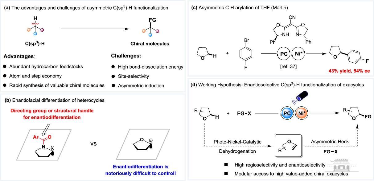 烴類化合物是化石能源的主要組成體,也是重要的基礎(chǔ)化工原料,具有品種豐富、來源廣泛、價格低廉等優(yōu)勢。直接斷裂烴類的C(sp3)-H鍵進(jìn)行不對稱轉(zhuǎn)化是最高效、綠色地合成高附加值的手性化合物的方法,然而這一策略面臨著化學(xué)選擇性、區(qū)域選擇性以及對映選擇性的挑戰(zhàn)。目前發(fā)展較為成熟的方法有:(1)利用導(dǎo)向基策略,過渡金屬直接進(jìn)行C-H鍵活化;(2)金屬卡賓物種對C-H插入。近年來,光促HAT與鎳催化實現(xiàn)C(sp3)-H鍵不對稱轉(zhuǎn)化受到科研人員的關(guān)注,目前已成功實現(xiàn)芐位以及酰胺α位C(sp3)-H鍵不對稱官能團(tuán)化反應(yīng)。但是,氧雜環(huán)的C(sp3)-H不對稱官能團(tuán)化反應(yīng)至今未有報道,其原因是:(1)醚α位C(sp3)-H鍵的BDE(~93 kcal/mol)高于芐位以及酰胺α位C(sp3)-H鍵,需要更強(qiáng)攫氫能力的HAT試劑;(2)與芐位以及酰胺α位C(sp3)-H鍵不同,不含導(dǎo)向基團(tuán)醚α位C(sp3)-H鍵兩端結(jié)構(gòu)類似,更加難以手性識別。針對上述挑戰(zhàn)性的難題,孔望清課題組另辟蹊徑,設(shè)想將光促HAT催化烷烴脫氫策略與鎳催化不對稱Heck反應(yīng)相結(jié)合,從而實現(xiàn)氧雜環(huán)C(sp3)-H鍵對映選擇性官能團(tuán)化反應(yīng)。