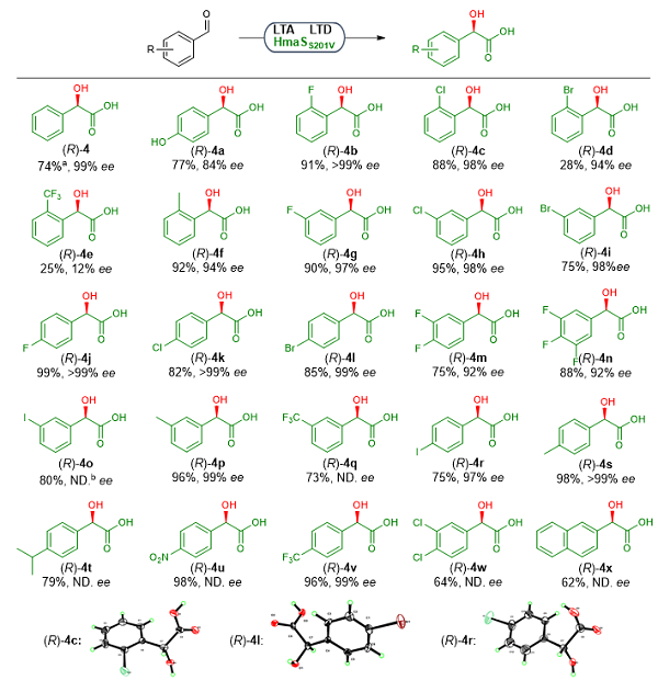 通過(guò)本項(xiàng)研究,合作團(tuán)隊(duì)開(kāi)發(fā)了高效的生物催化級(jí)聯(lián)反應(yīng)和工程菌,從易得原料苯甲醛及甘氨酸出發(fā),以高產(chǎn)率和高對(duì)映選擇性獲得各種手性扁桃酸衍生物,該方法無(wú)需額外添加輔助因子,為扁桃酸類(lèi)化合物的不對(duì)稱(chēng)合成提供了無(wú)氰化物的綠色生物合成新技術(shù)。