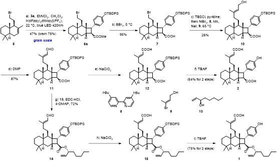 近期,專題組對該種植物中所發(fā)現(xiàn)的兩個具有6/6/4骨架雜二萜(+)-isoscopariusins B(1)和C(2)開展了合成研究。其中,化合物1是(-)-isoscopariusin A的非對映異構(gòu)體,而化合物2為C-8'羧酸取代的雜二萜(圖1)?;衔?/span>1和2的構(gòu)型確證存在一定的挑戰(zhàn),且天然含量較低也限制了對其開展生物活性研究。為解決以上問題,對化合物1和2開展了仿生合成研究(圖2)。關(guān)鍵的合成挑戰(zhàn)在于如何高效構(gòu)建具有四個立體中心的環(huán)丁烷中間體。為此,研究人員發(fā)展了以簡單易得的三取代烯烴5和4-OTBDPS-肉桂酸甲酯3a為底物,成功實現(xiàn)基于路易酸和銥光催化劑協(xié)同催化的分子間光化[2+2]環(huán)加成反應(yīng)一步構(gòu)建復(fù)雜的環(huán)丁烷中間體6a,并且實現(xiàn)了克級規(guī)模制備,其絕對構(gòu)型通過單晶X-ray衍射得以確證。隨后6a經(jīng)過選擇性脫甲酯、Ni催化交叉偶聯(lián)、氧化、酯化及保護基脫除等化學(xué)轉(zhuǎn)化,最終由三取代烯烴5為原料,分別以七步和六步完成了isoscopariusins B和C的仿生合成。該研究工作不僅實現(xiàn)了兩個化合物絕對構(gòu)型的確證,同時也為其后續(xù)的生物活性研究奠定了重要的物質(zhì)基礎(chǔ)。