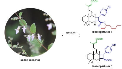 圖1 帚狀香茶中所發(fā)現(xiàn)的雜二萜isoscopariusins B和C